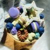 Krásná skleněná dóza s víčkem z bambusu, které je zdobeno bílou čokoládou a bobulovým ovocem z polymerové hmoty