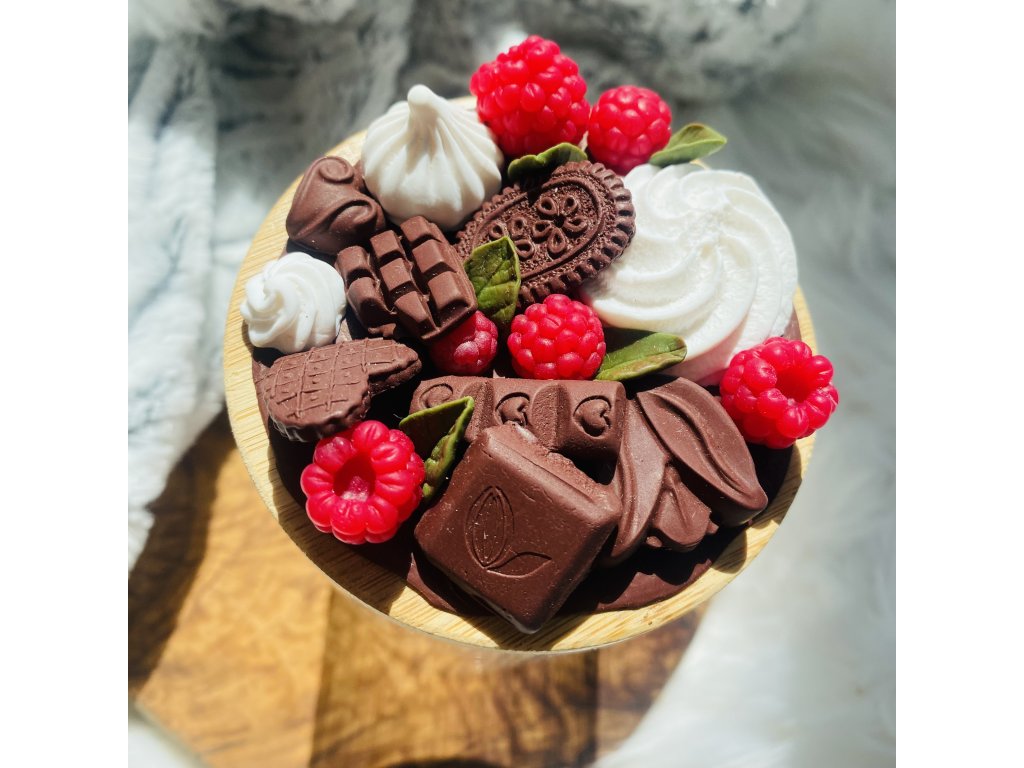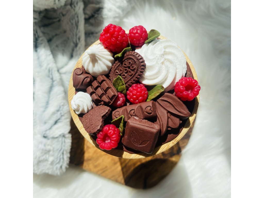 Krásná skleněná dóza s víčkem z bambusu, které je zdobeno čokoládou, malinami a sněhovými pusinkami.